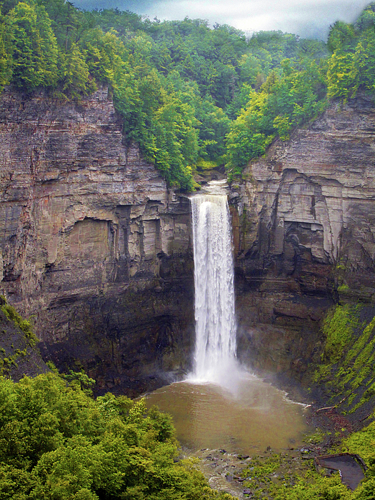 Taughannock Falls in the Finger Lakes region of New York State. The majestic Taughannock waterfall cascades down a steep cliff into a pool surrounded by lush greenery. The cliffs display layers of exposed rock, creating a striking contrast with the soft flow of the water.