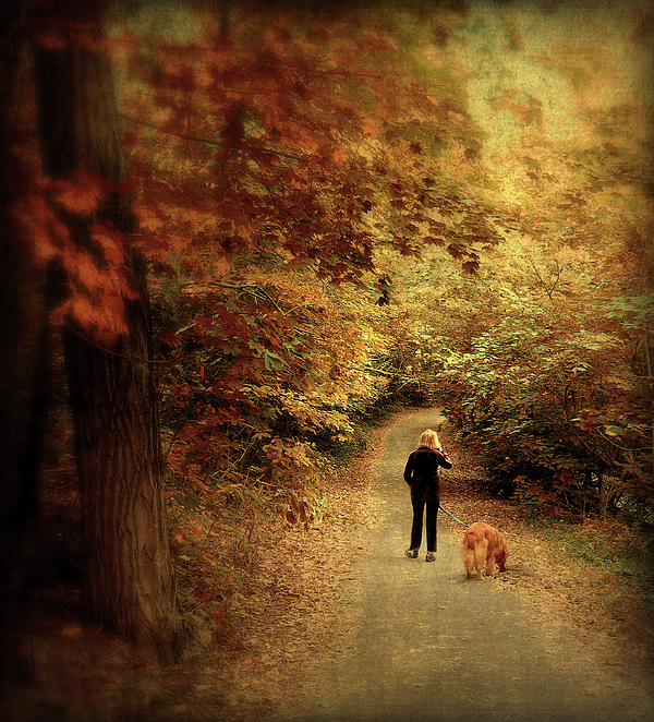 A woman walks a golden retriever through a forest path, surrounded by vibrant autumn foliage. The rich, warm hues create a serene and nostalgic atmosphere, inviting viewers to imagine the crispness of fall air. The scene captures the quiet companionship and beauty of a leisurely stroll in nature.