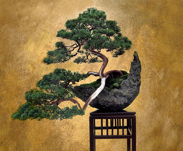 A meticulously shaped bonsai tree rests on an intricately carved rock, set against a rich, golden backdrop. The tree's lush green foliage and elegant curves contrast with the rugged texture of the rock, creating a harmonious balance. Subtle shadows and highlights accentuate the bonsai's refined structure.