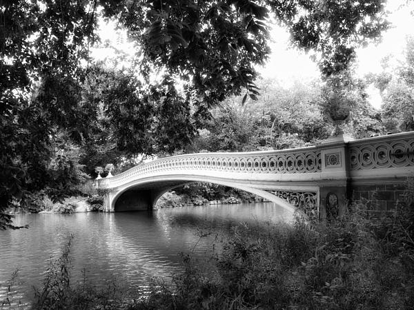 Bow Bridge, shaped like an archer's bow, was built between 1859 and 1862 Located in New York's Central Park, It is the second oldest iron-cast bridge in the US . The serene black-and-white scene features a gracefully arched Bow Bridge over a calm river. Surrounding foliage frames the peaceful setting.