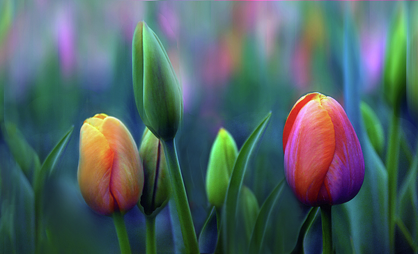 Vibrant tulips are in varying stages of bloom against a softly blurred background that suggests a lush garden. With delicate veins and a gentle... more