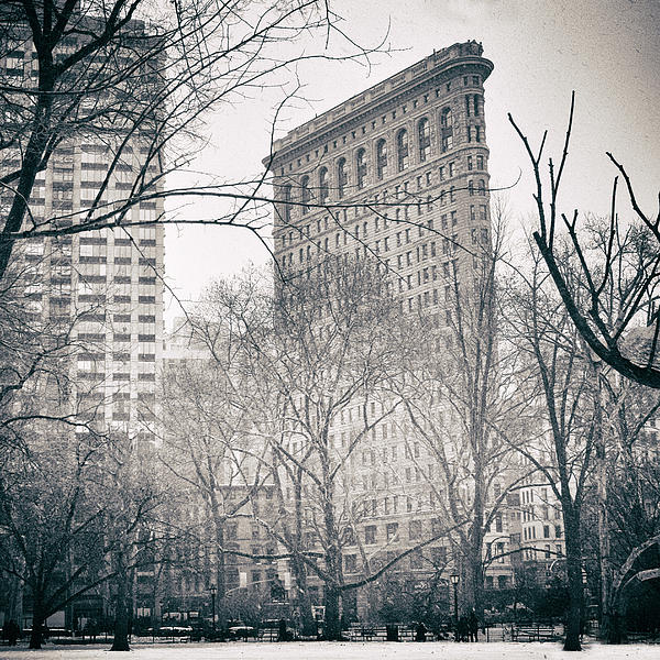 The distinctive triangular shape of the Flatiron Building was designed by Chicago architect Daniel Burnham and built in 1902, The building stands tall amidst a grove of leafless trees, giving off a nostalgic, wintery feel. The barren branches create intricate patterns against the sky, enhancing the urban city's historical ambiance. The monochrome tone adds a touch of timeless elegance to the scene.