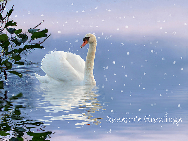 A graceful swan glides across a tranquil lake surrounded by softly falling snowflakes. Branches frame the peaceful scene, and a festive "Season's Greetings" message is elegantly placed in the corner.