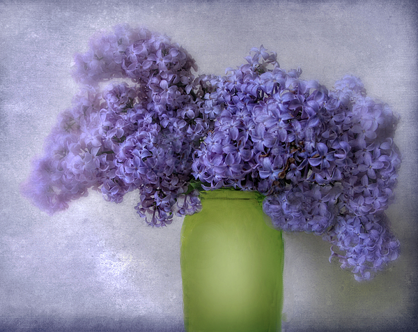 A lush bunch of blue lilacs presents a vivid splash of color as it overflows from a bright green vase. The soft, dreamlike quality of the photo gives... more