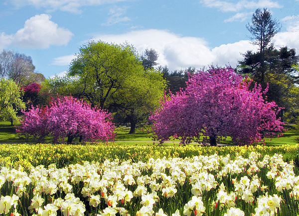 Vibrant pink cherry blossom trees bloom amongst a field of yellow and white daffodil flowers on a bright day with fluffy clouds scattered across the... more