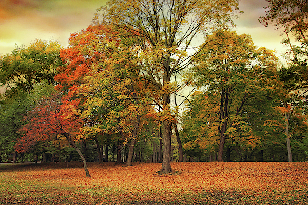 Vibrant autumn leaves create a colorful canopy in a tranquil park, where the ground is carpeted with fallen foliage. Overcast skies give a soft light... more