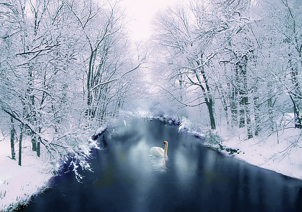 A serene swan glides gracefully along a narrow river, surrounded by a mesmerizing winter landscape blanketed in snow. The bare trees on either side frame the tranquil scene, adding to the peaceful and quiet ambiance.