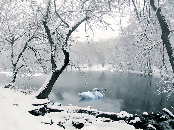 Two swans gracefully glide across a tranquil, icy lake surrounded by snow-laden trees. The serene winter landscape is softened by the gentle... more
