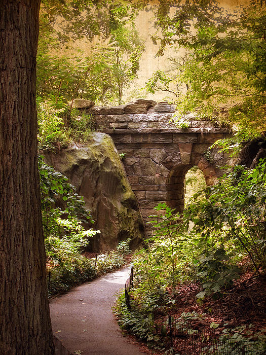 Nestled in a dense nook of trees and shrubbery on the west side of the Ramble, the rough stone arch carries a narrow walkway and a footpath below. Placed in a cleft between two high rock outcrops, Ramble Arch is considered one of the