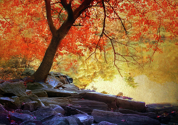 Vibrant autumn maple leaves drape gracefully from the branches of a tree overlooking a calm lake. Rocky terrain provides a natural foreground, while... more