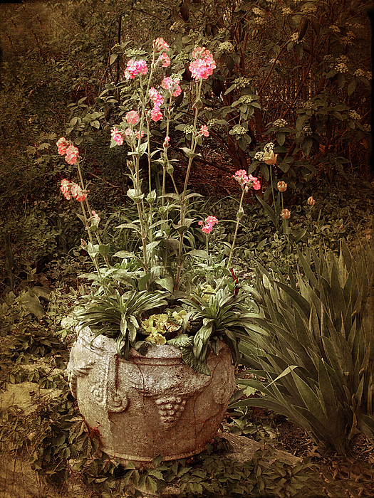 A rustic stone pot overflows with tall flowering plants and lush foliage, surrounded by a dense and verdant garden landscape. The muted tones add a vintage feel to the scene.